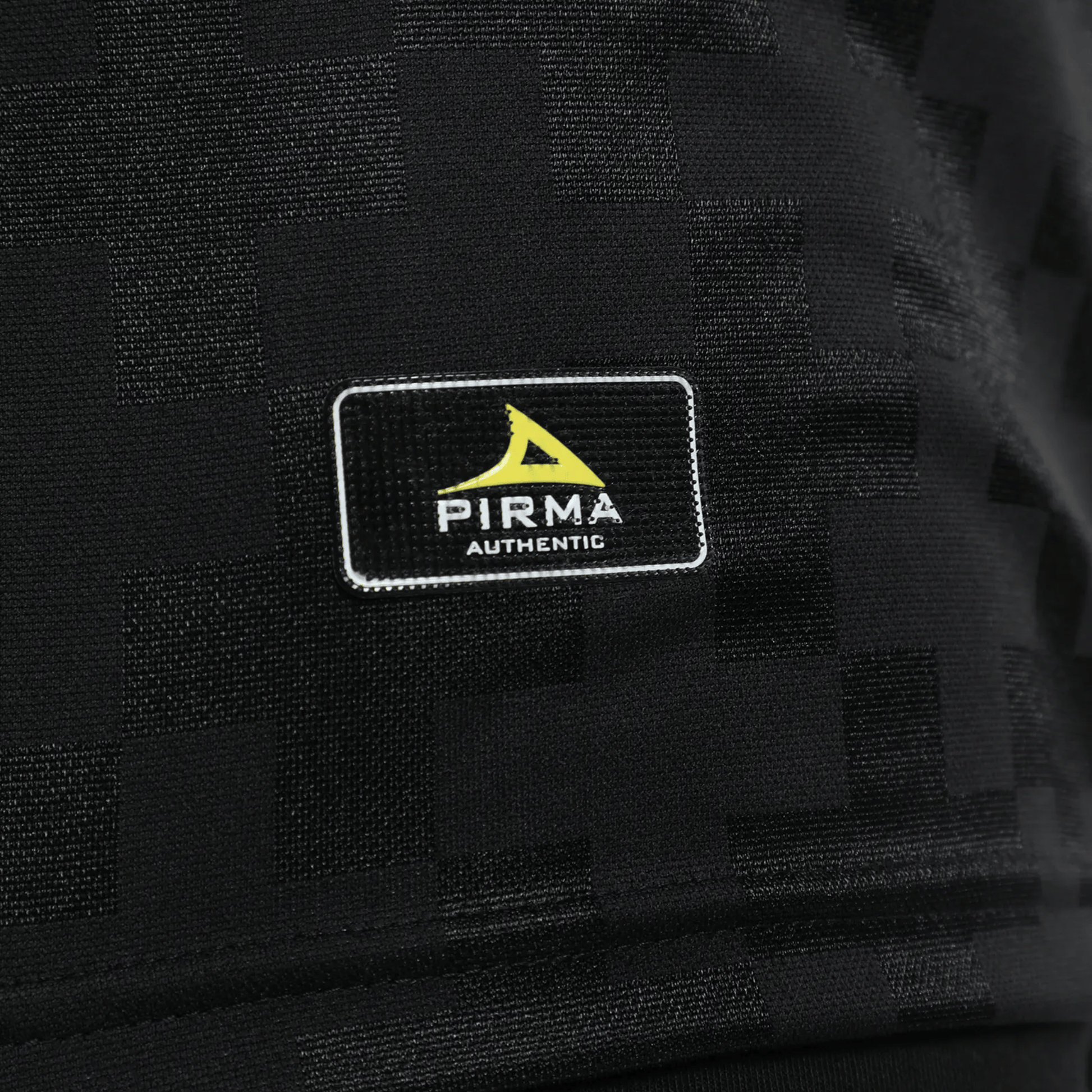 El jersey está fabricado con una tela de microfibra de poliéster de 150 gr de peso, adicionada con tecnología coolfit para absorber el sudor, antibacterial y filtro contra rayos UV. El diseño está inspirado en un diseño que fusiona lo oscuro a través de una vista audaz protagonizado por una tela de cruces. El color negro profundo no solo transmite sobriedad o fuerza, sino que también aporta un toque de elegancia y sofisticación. en el cual destacan el escudo de la institución y logotipo de PIRMA, fabricados con poliuretano y colocados con tecnología termo adherible, además de un mesh hecho de tejidos especiales para favorecer la transpiración. Incluye también el holograma de autenticidad de producto, y una cintilla holográfica con un código de seguridad encriptado.